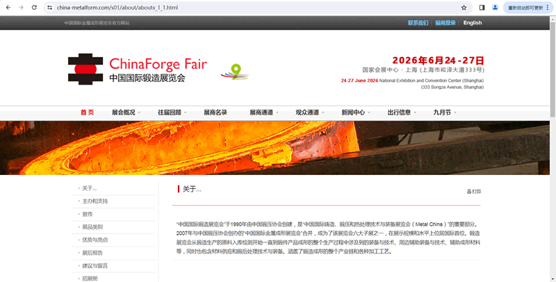 “中国国际锻造展览会”于1990年由中国锻压协会创建,是“中国国际铸造、锻压和热处理技术与装备展览会(Metal China)”的重要部分。2007年与中国锻压协会创办的“中国国际金属成形展览会”合并,成为了该展览会六大子展之一,在展示规模和水平上位居国际首位。锻造展览会从锻造生产的原料入库检测开始一直到锻件产品成形的整个生产过程中涉及到的装备与技术、周边辅助装备与技术、辅助成形材料等,同时也包含材料供应和锻后处理技术与装备。涵盖了锻造成形的整个产业链和各种加工工艺。