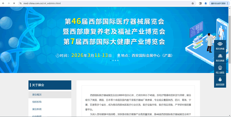 为深入贯彻健康中国战略,加快推动医疗健康产业高质量发展,第46届西部国际医疗器械展览会将于2026年3月11-13日在西安国际会展中心隆重举行。本届展会将继续邀请西部各省市医疗机构、行业协会、采购商、经销代理商及行业专家参与,打造一个集展览展示、专业论坛、供需对接、商贸洽谈和系统服务于一体的全方位、多层次、高品质的行业盛会,助力医疗器械产业高质量发展。