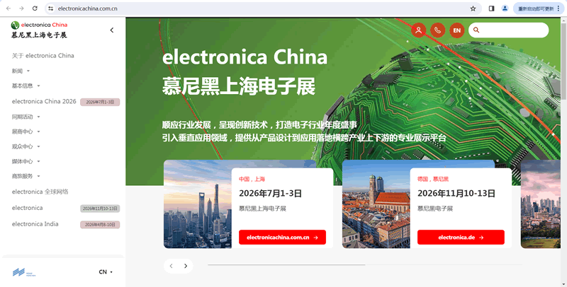 Electronica China2026慕尼黑上海电子展2026年7月1-3日上海新国际博览中心举行,上海奥韵SINCE2007提供电子元器件展展台设计,连接器展展台搭建,工业电子展展位设计,汽车电子展展位搭建,集成电路展展会设计,电子博览会展会搭建,电子展展台设计,半导体展展台搭建,专业半导体展展位搭建服务.