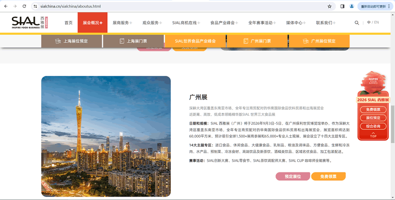 日期和规模:SIAL 西雅展(广州)将于2026年9月3日-5日,在广州保利世贸博览馆举办,作为深耕大湾区覆盖东南亚市场,全年专注商贸配对的华南国际食品饮料贸易和出海展览会,展览面积将达到60,000平方米,预计吸引全球1,500+展商参展和65,000+专业人士观展,展会设立了十四大主题专区。
