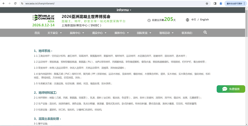 World of Concrete Asia 亚洲混凝土世界博览会作为全球混凝土行业知名的展会品牌“混凝土世界博览会”系列的亚洲站,一站式展示混凝土、地坪、砂浆三大领域的高品质产品与领先技术。展会以混凝土地面建设为中心,向混凝土立面建筑发展,包含混凝土建筑原材料、混凝土建筑添加剂、混凝土建筑及机械设备、混凝土表面处理设备及配件、地坪原材料、多样性地坪系统、成品砂浆、砂浆添加剂、砂浆成套生产及喷涂设备等产品。WOCA已打造成为混凝土、地坪、砂浆行业一站式展览及贸易平台,推动亚洲地区混凝土建筑行业的绿色发展国际化、多元化的发展。