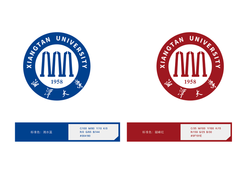 湘潭大学校徽有“韶峰红”和“湘水蓝”两套标准色,总体设计简约而不简单。“韶峰红”与“湘水蓝”来自校歌“韶峰高,湘水长”。“韶峰红”取自伟人故里韶山,是主席铜像广场上飘扬的红旗与巍巍韶峰交映的颜色,彰显着湘大人坚定勇敢与自强不息。“湘水蓝”取自湖南的母亲河湘江,清晨的湘江静谧悠长,默默地守护着三湘大地,寓意着湘大守护着万千学子成长成才。