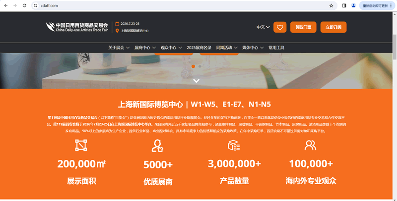 第119届中国日用百货商品交易会(“百货会”)将于2026年7月23-25日在上海新国际博览中心举行,17大展馆,全新启航,涵盖 W1-W5, E1-E7, N1-N5 展馆。本届展会将再创历史新高,10大主题展区引爆采购狂潮,展览面积超20万平方米,参展企业5000余家。东大厅、南大厅、北大厅,三个大厅同时开放,将加速展商与观众报道、注册入场的速度和更好的参展和参观体验。