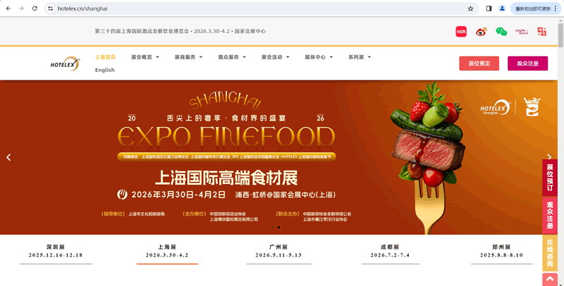 HOTELEX上海展将在2026年3月30~4月2日在上海盛大举办!展会将继续在浦西虹桥的国家会展中心全面铺开,火力全开。同时将引入来自酒店及餐饮业、食品饮料、咖啡茶饮、连锁加盟等行业上游供应链的千家优质展商、更以数十项精彩丰富的活动赛事及高峰论坛为万名专业观众呈现出一场精彩的食饮盛宴!