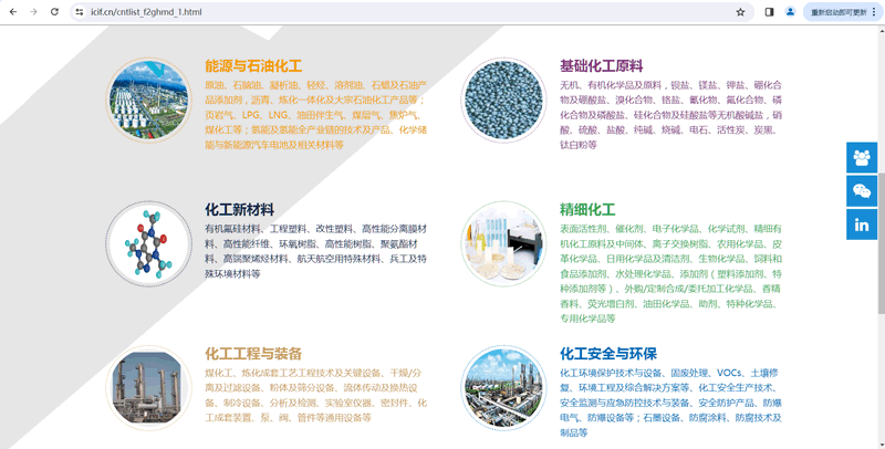 煤化工、炼化成套工艺工程技术及关键设备、干燥/分离及过滤设备、粉体及筛分设备、流体传动及换热设备、制冷设备、分析及检测、实验室仪器、密封件、化工成套装置、泵、阀、管件等通用设备等