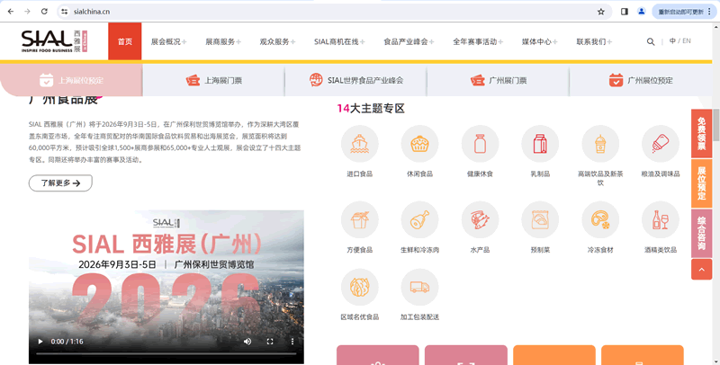 日期和规模:SIAL 西雅展(广州)将于2026年9月3日-5日,在广州保利世贸博览馆举办,作为深耕大湾区覆盖东南亚市场,全年专注商贸配对的华南国际食品饮料贸易和出海展览会,展览面积将达到60,000平方米,预计吸引全球1,500+展商参展和65,000+专业人士观展,展会设立了十四大主题专区。
