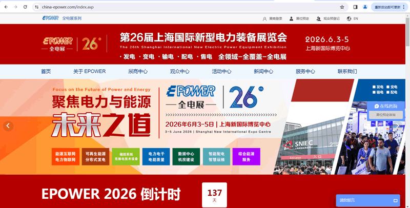 为促进电力能源全产业链、全价值链协同创新,推动“双链”融合「EPOWER全电展」第26届上海国际新型电力装备展览会将于2026年6月3-5日在上海新国际博览中心举办。展会聚焦电力能源未来之道,搭建产业生态平台,集中呈现发电、输电、变电、配电、用电、调度、通信等环节新产品、新技术、新应用,助力电力装备高质量发展。