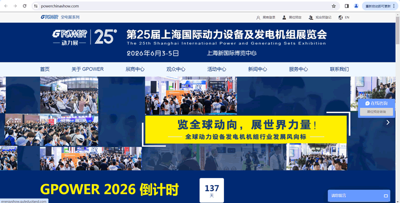 第25届上海国际动力设备及发电机组展览会(简称:GPOWER动力展)----动力设备发电机组领域具有广泛影响力的品牌展会;品牌宣传、贸易拓展、前沿科技和信息交流的首选平台;全球头部企业新品宣发主战场。由中国内燃机工业协会、中数智慧信息技术研究院CDCC、中国内燃机工业协会应急动力装备专委会、中国电器工业协会内燃发电设备分会指导, 第25届上海国际动力设备及发电机组展览会定于2026年6月03日-05日在上海新国际博览中心举办。