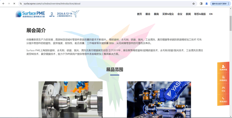 Surface PME上海国际磨削、去毛刺、研磨、抛光、清洗及真空镀膜展览会创 立于2019年,展会聚焦精密磨削/超精研磨技术、去毛刺/研磨/抛光技术、工业清洗及清洁度控制技术、真空镀膜技术,致力于为终端用户提供零部件表面精密加工整体解决方案。