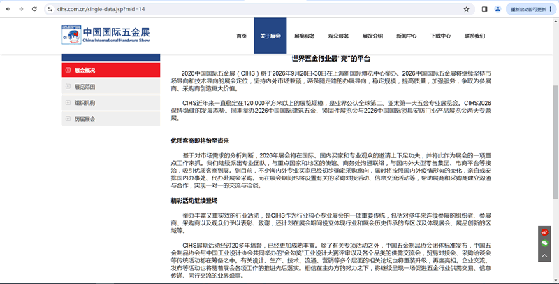 2026中国国际五金展(CIHS)将于2026年9月28日-30日在上海新国际博览中心举办。2026中国国际五金展将继续坚持市场导向和技术导向的展会定位,坚持内外市场兼顾,两条腿走路的办展导向,稳定规模,提高质量,加强服务,争取为参展商、采购商创造更大价值。