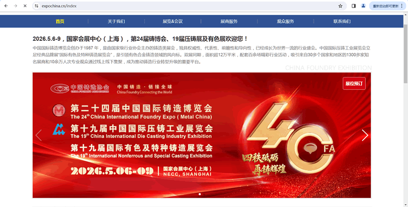 秉承行业引领、创新发展、服务行业的宗旨,第二十四届中国国际铸造博览会、第十九届中国国际压铸工业展览会、第十九届国际有色及特种铸造展览会将于2026年5月6-9日在国家会展中心(上海)盛大举办。