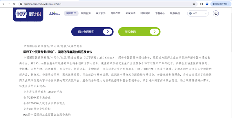 中国国际医药原料药/中间体/包装/设备交易会(以下简称:API China),深耕中国医药市场40余年,现已成为医药工业全球品牌开拓中国市场的重要平台。API China展会展会以服务药品全链条创新为核心使命,覆盖药品从研发至生产全流程各个环节过程中产品与技术。参展企业涵盖医药原料药、中间体、天然产物、药用辅料、医药包装、制药设备、生物制药、医药研发与生产外包服务(CRO/CDMO/CMO)等多个领域。全面展示中国医药工业领域的新产品、新技术。每届展会同期,聚焦政策趋势、行业前沿与热点议题,组织数十场技术交流论坛与研讨会,传播先进制药理念,为参会者搭建了促进医药工业领域信息共享与合作共赢的商贸交流平台。展会还借助庞大的自有数据库和整合营销平台,吸引海外买家前来展会现场,助力展商链接海外需求,拓宽企业的业务边界。